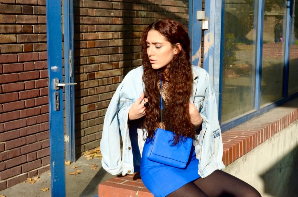 Ich habe für meinen Streetstyle Look einen Body mit Netz-Cut-Outs mit meinen momentanen Favourites kombiniert: Einem königsblauen Mini , der neben dem Schnitt vor allem durch seine Seitentaschen heraussticht. Und meiner Jeansjacke, die einst noch mein Papa in jungen Jahren trug und original von meiner Omi geflickt wurde.
